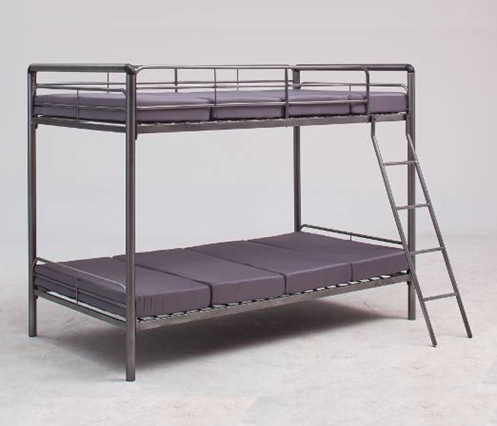 Open Size:Bed:1985 W x1062 D/1560(w/ladder)x1546(H)mm Package Size:2120X520X230(H)mm Net Weight: 64.6 kg Package Q’ty: 1 pc/CTN Container Load: 270 pcs/40’ Product Features: Powder coated tubular steel bunk beds with plug-in spindles for compact packaging and easy assembly. Supplied with vacuum compress packed coil mattress.