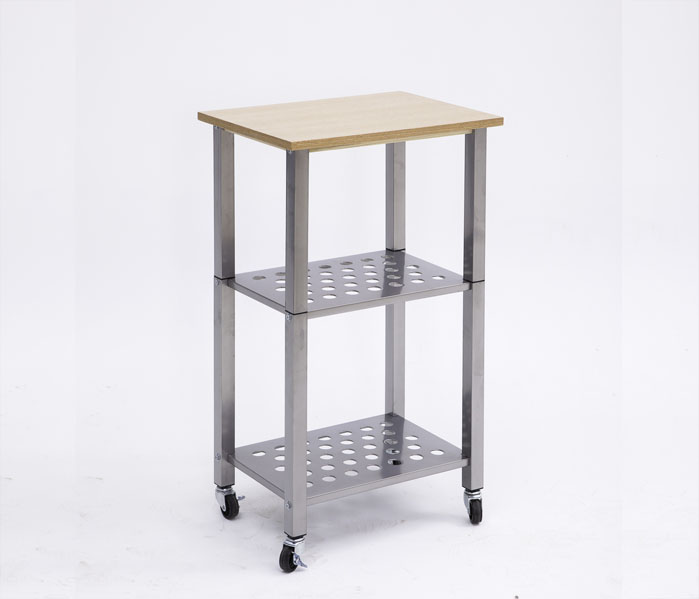 Open Size:345x210x150(H)mm Package Size:645x415x115(H)mm Net Weight: 5.9kg Package Q’ty: 1 pc/CTN Container Load: 2172 pcs/40’ Product Features: Genuine wood cart top on powder coated frame and metal shelves, packed in RTA version, features easy assembly and cleaning.